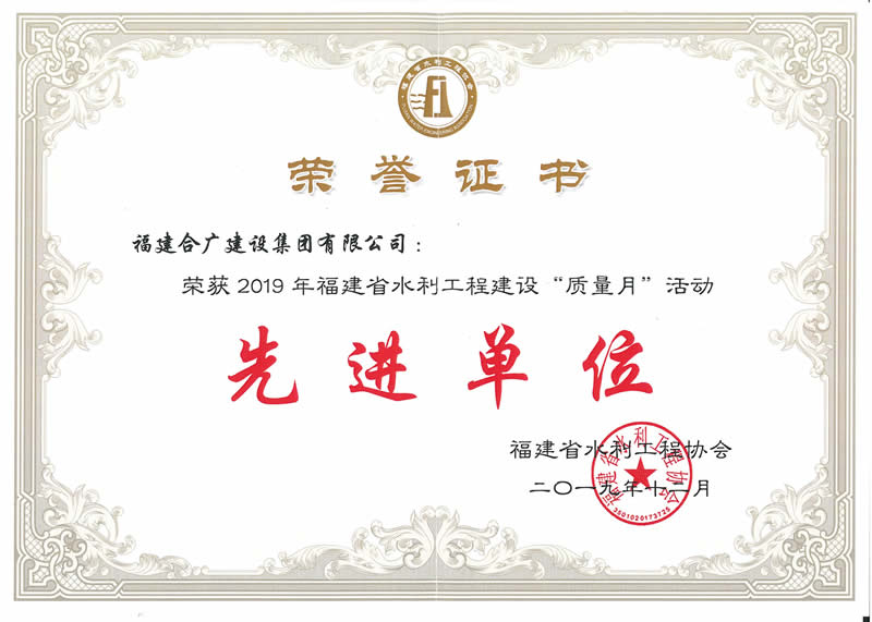 • 福建合廣建設集團有限公司2020年費水利工程質量月榮譽證書